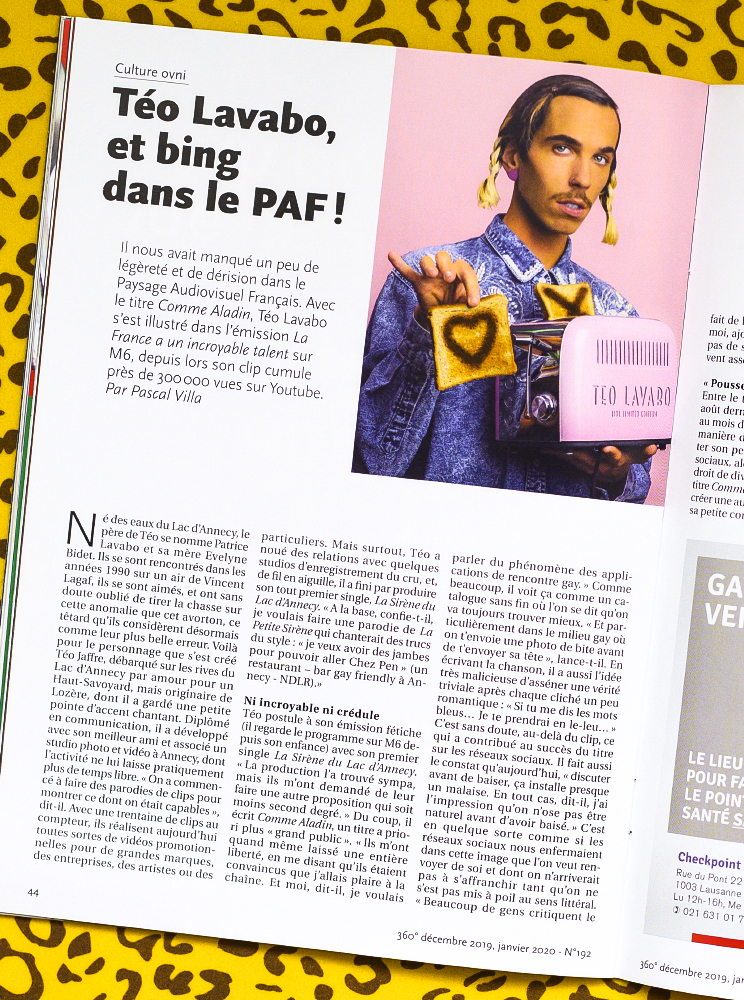 2020 commence avec un premier article dans le célèbre magazine Suisse LGBT 360°. L'occasion de promouvoir la sortie du nouveau clip de Téo Lavabo "Caresse ma Salopette".